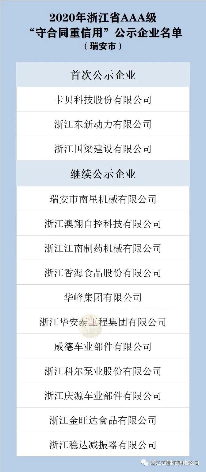 近日,2020年浙江省AAA级“守合同重信用”公示企业名单出炉,瑞安14家企业上榜。其中首次公示企业3家,继续公示企业11家,公示期为两年。一起来看具体名单~